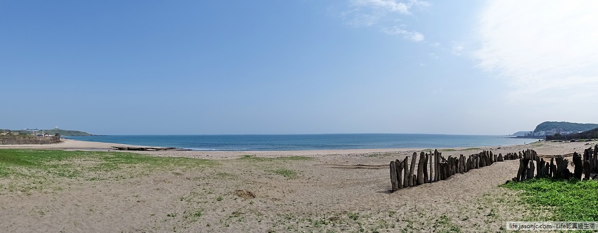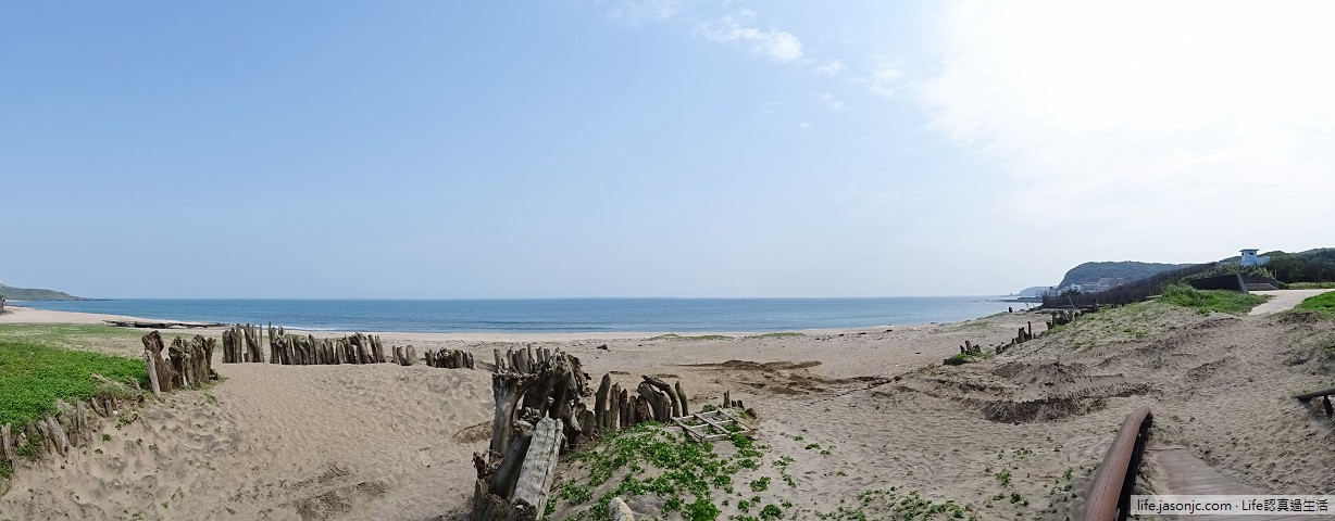 爬到上頭來是一片開朗的風景,平坦的沙灘加上強勁的海風,果真是放風箏的好所在,只是石門風箏節在9月,所以現在這裡只有空曠的海天一色美景。